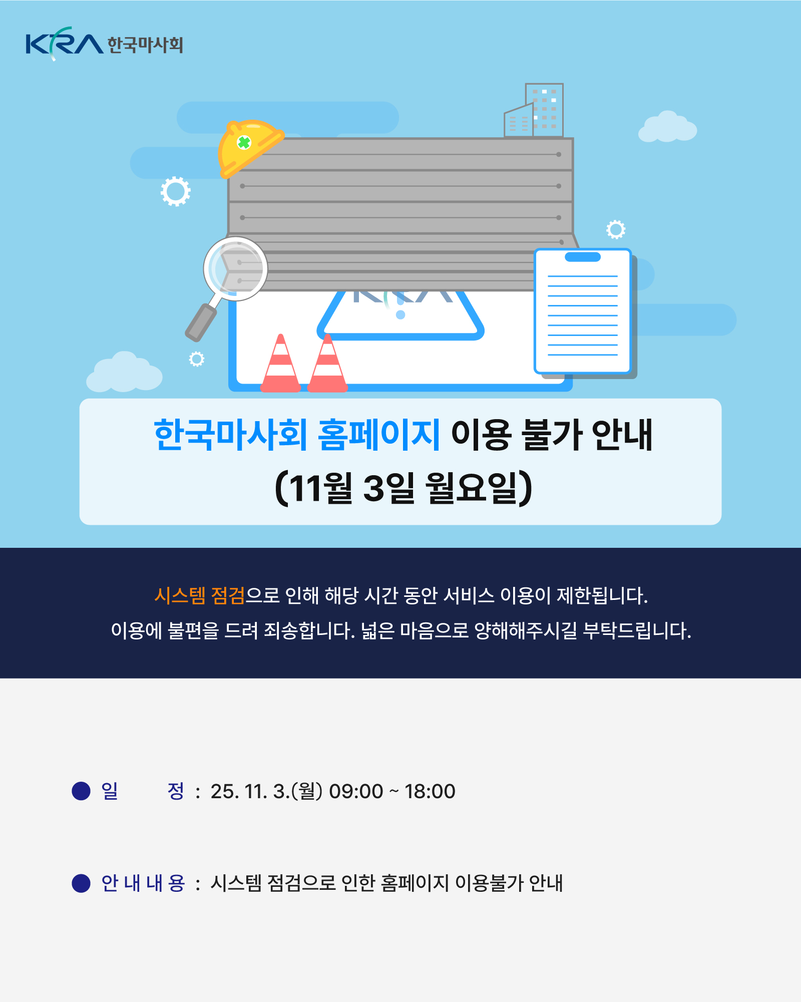 한국마사회 기업정보 홈페이지 (www.kra.co.kr) 시스템 점검 안내드립니다.