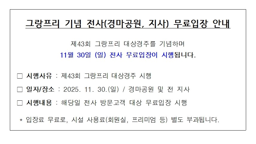 [전사] 그랑프리 기념 경마공원 및 지사 무료입장 시행(11.30.)